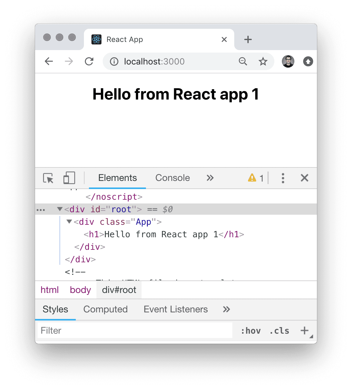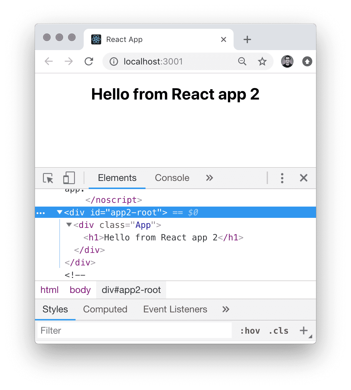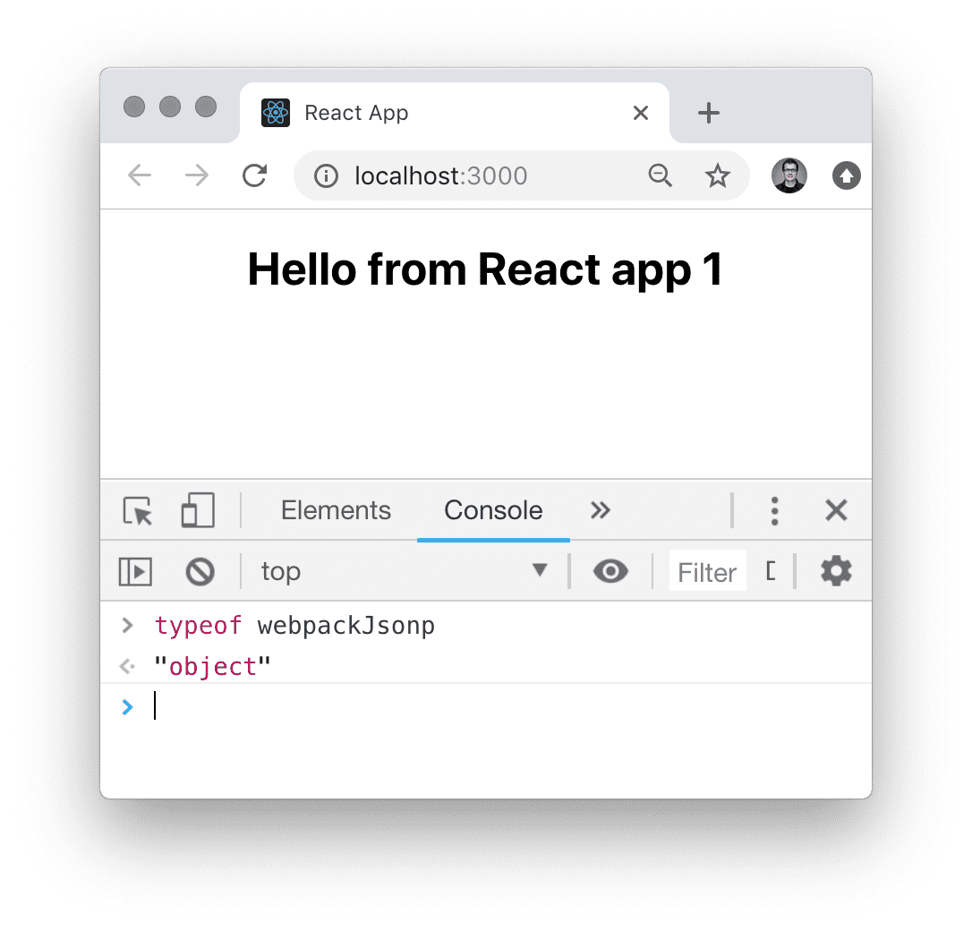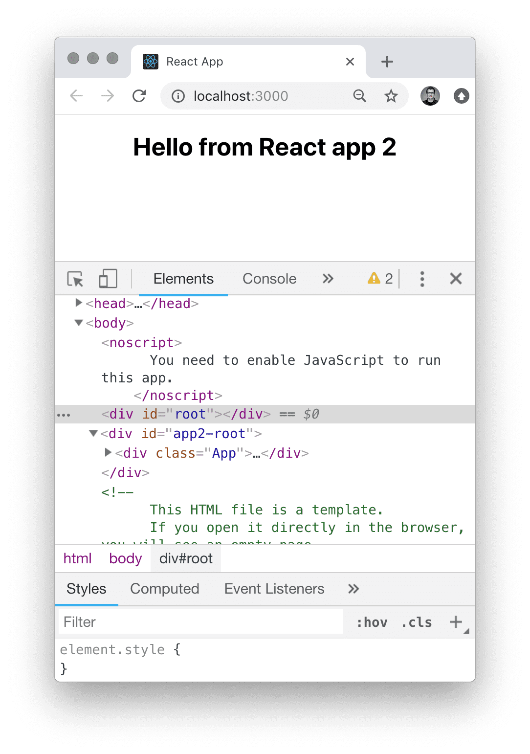 1// index.html2<div id="app2-root"></div>34<script src="http://localhost:3001/static/js/bundle.js"></script>5<script src="http://localhost:3001/static/js/1.chunk.js"></script>6<script src="http://localhost:3001/static/js/main.chunk.js"></script>